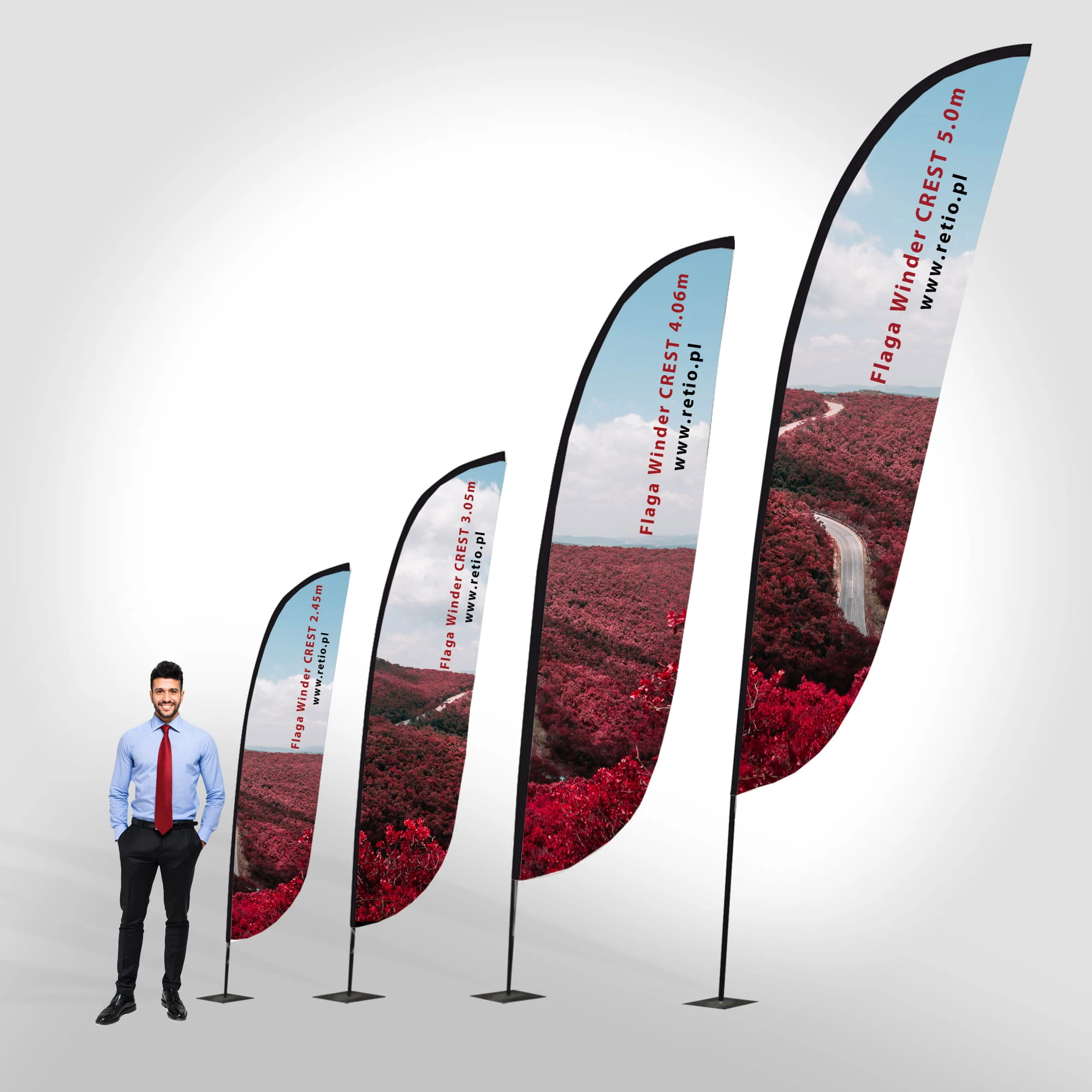 Flagi reklamowe, jakie zawiera nasza oferta są nośnikami spektakularnymi, z nowoczesnymi rozwiązaniami, ale z zachowaniem klasycznych, uniwersalnych kształtów. Retio oferuje Państwu bardzo szeroki wachlarz tego typu systemów wystawienniczych w czterech kształtach: prostokąt, feather, quill oraz crest. Nośniki te są coraz chętniej i częściej wybierane przez uczestników targów, przedsiębiorców chcących uwidocznić swoją firmę outdoor, zwrócić uwagę odbiorców przekazów reklamowych oraz chcących wyróżnić się na tle konkurentów. Odpowiednie do każdego otoczenia - od zatłoczonych reklamami ulic, poprzez imprezy zewnętrzne, aż do imprez zamkniętych wewnątrz budynków typu wystawa, targi.