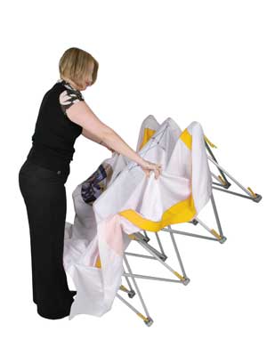 - Napinana ścianka pod tkaninę, z możliwością składania jej wraz z materiałem;