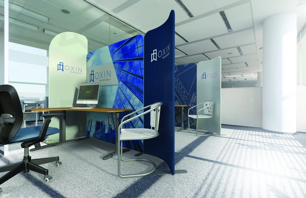 Wydruk wykonujemy techniką sublimacji na wysokiej jakości materiale Display Stretch 180 g, który cechuje znakomite nasycenie bartw. W tym wypadku są to dwie warstwy materiału połączone ze sobą zamkiem, dzięki któremu po naciągnięciu grafiki na stelaż możemy ją idealnie napiąć. Zamek jest ukryty pod maskownicą, nie zaburza więc estetyki stoiska.