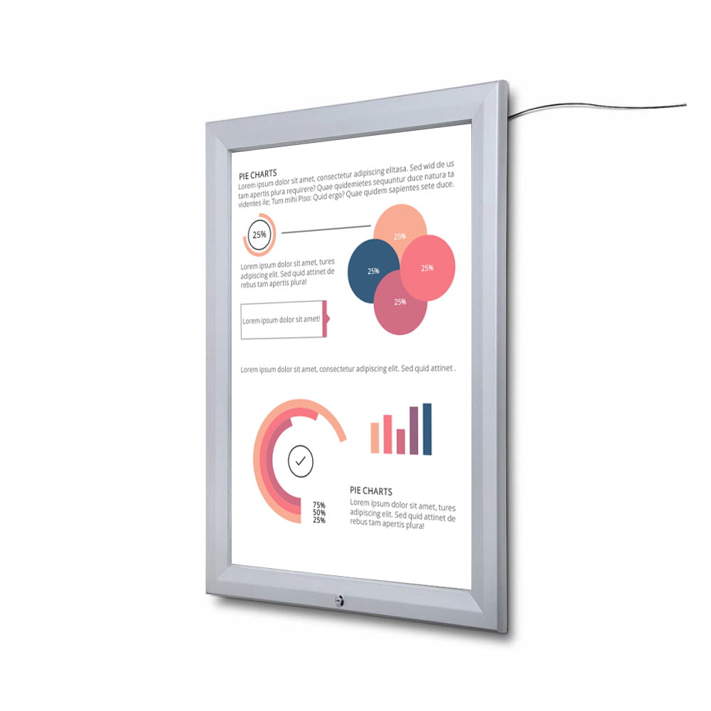 Rama gabloty została wykonana z wysokiej jakości aluminium w kolorze srebrnym, odpornego na trudne warunki atmosferyczne. Solidny mechanizm otwierania i zamykania pozwala łatwo i sprawnie aktualizować treści w gablocie. Zintegrowane podświetlenie LED doskonale doświetli prezentowane treści, nawet po zmroku.
