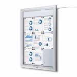 Rama gabloty została wykonana z wysokiej jakości aluminium w kolorze srebrnym, odpornego na trudne warunki atmosferyczne. Solidny mechanizm otwierania i zamykania pozwala łatwo i sprawnie aktualizować treści w gablocie. Zintegrowane podświetlenie LED doskonale doświetli prezentowane treści, nawet po zmroku.