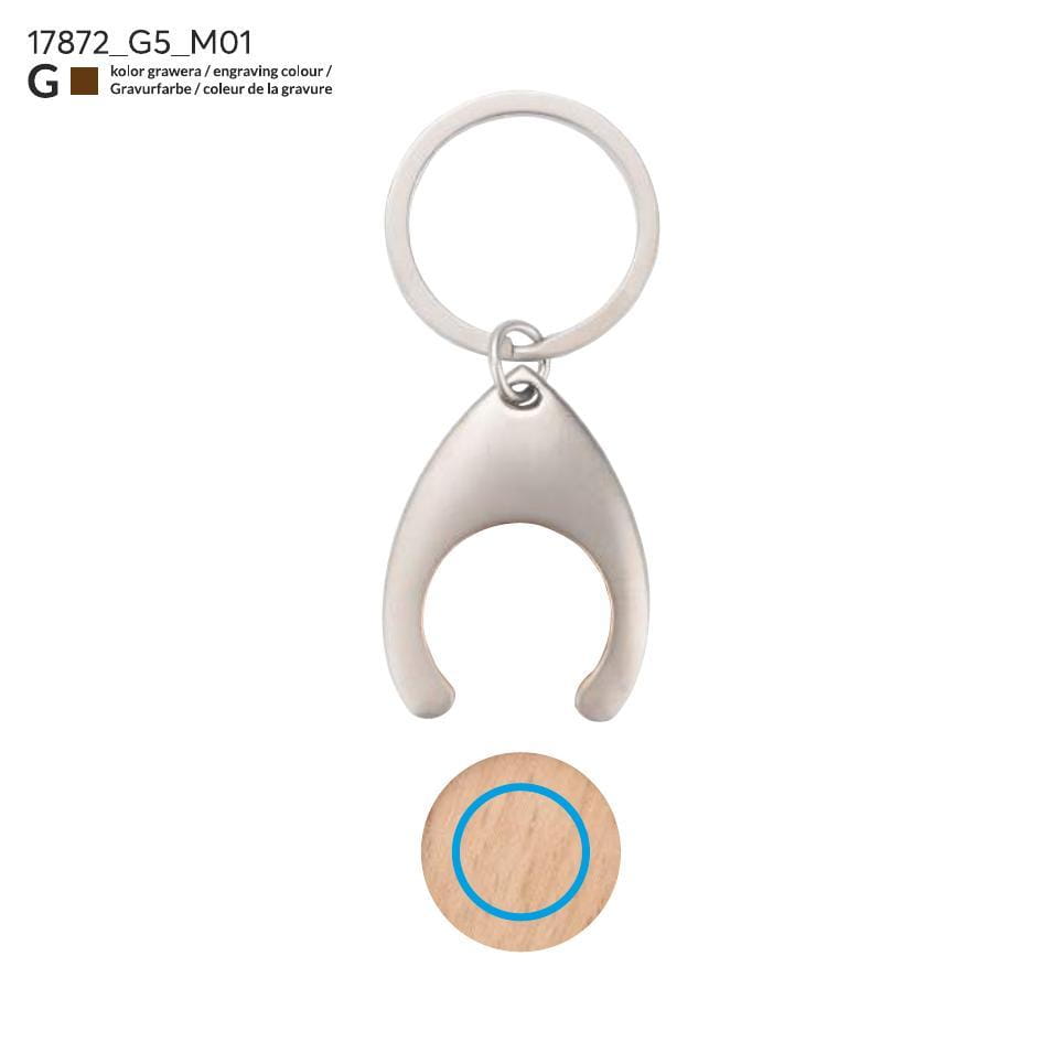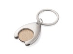 Brelok metalowy wraz z żetonem wykonanym z drewna mebli po recyklingu. Żeton pasuje do wózków sklepowych. Zapakowany w brązową kopertę.