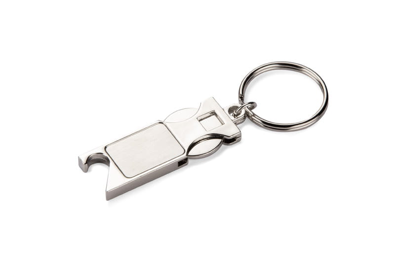 Metalowy brelok SPRITI to elegancki i trwały gadżet reklamowy, łączący funkcję otwieracza do butelek i żetonu do wózka sklepowego.