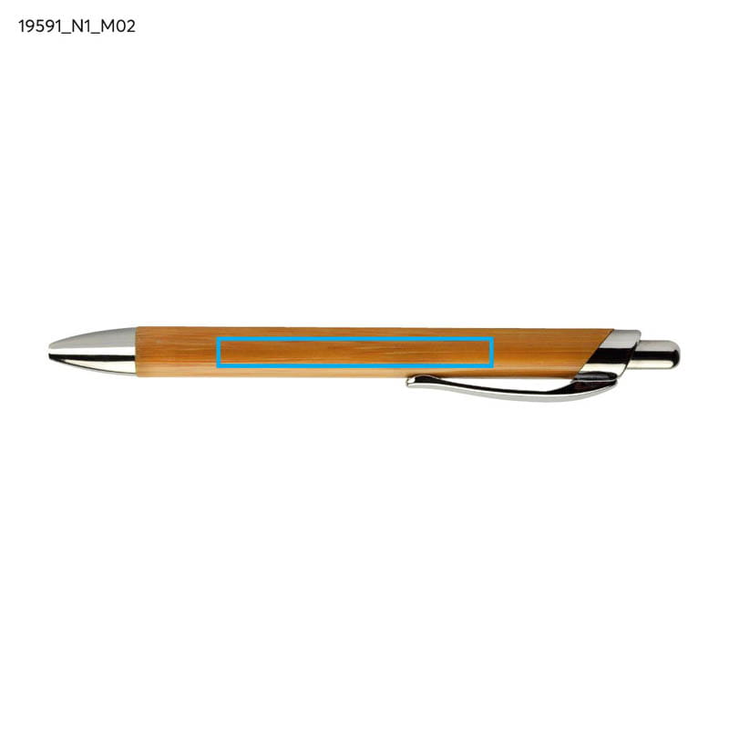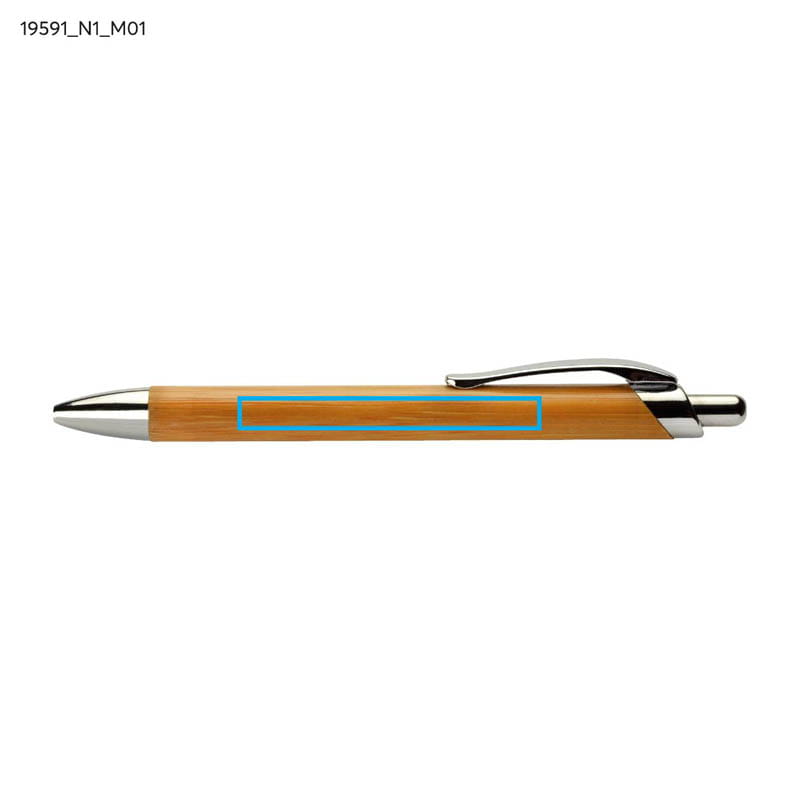 Stylowy długopis z bambusowym korpusem. Niezwykle przyjemna w dotyku faktura drewna z pewnością zwróci uwagę każdego klienta. Długopis jest wykończony metalowymi elementami w kolorze srebrnym. Znakowanie możliwe na bambusowym korpusie.