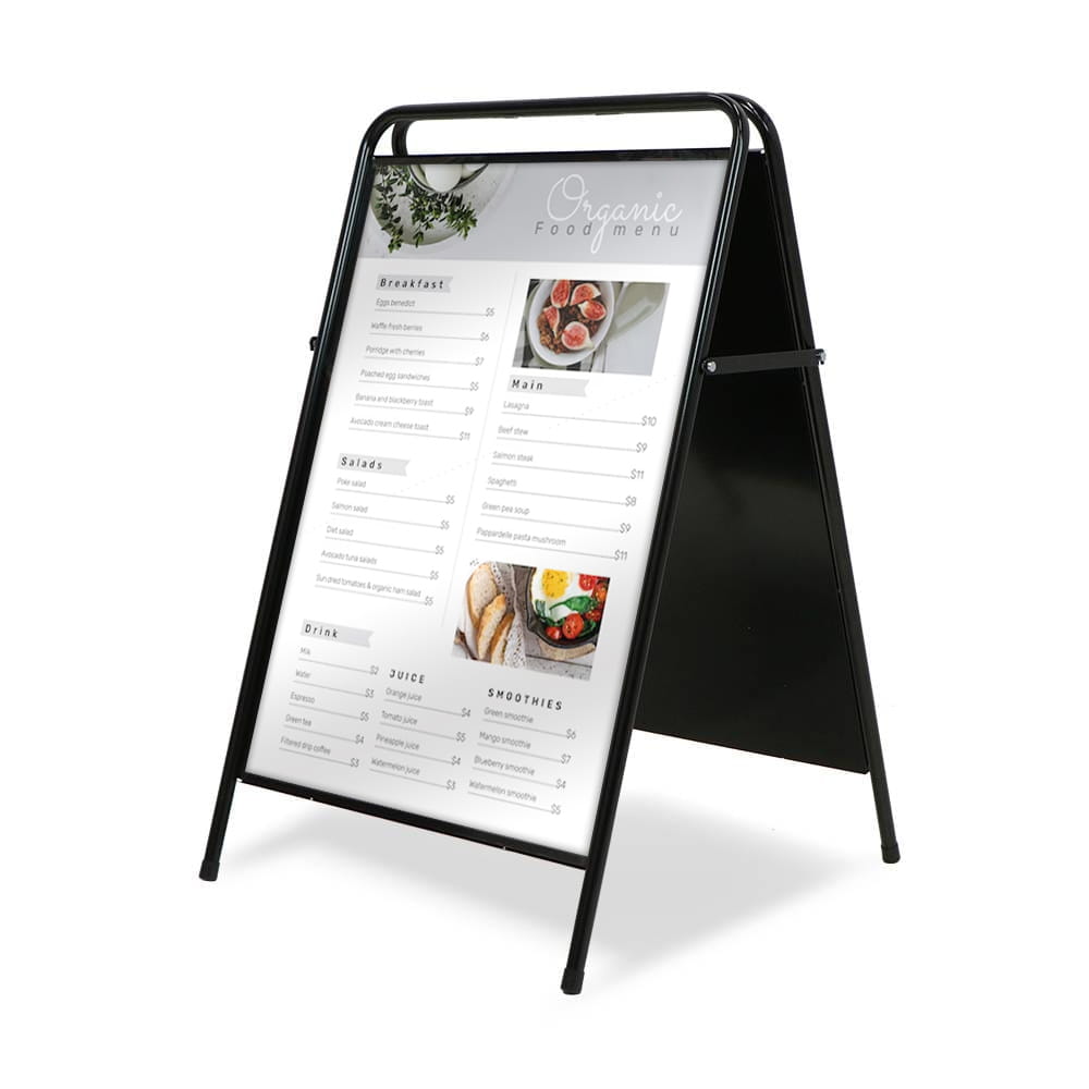 Brakuje ci solidnego i stylowego rozwiązania ekspozycyjnego? Stalowy potykacz w kolorze czarnym zapewni Ci czytelność, dzięki dużej ramie przeznaczonej do prezentacji plakatu, bądź oferty Twojej firmy dwustronnie.