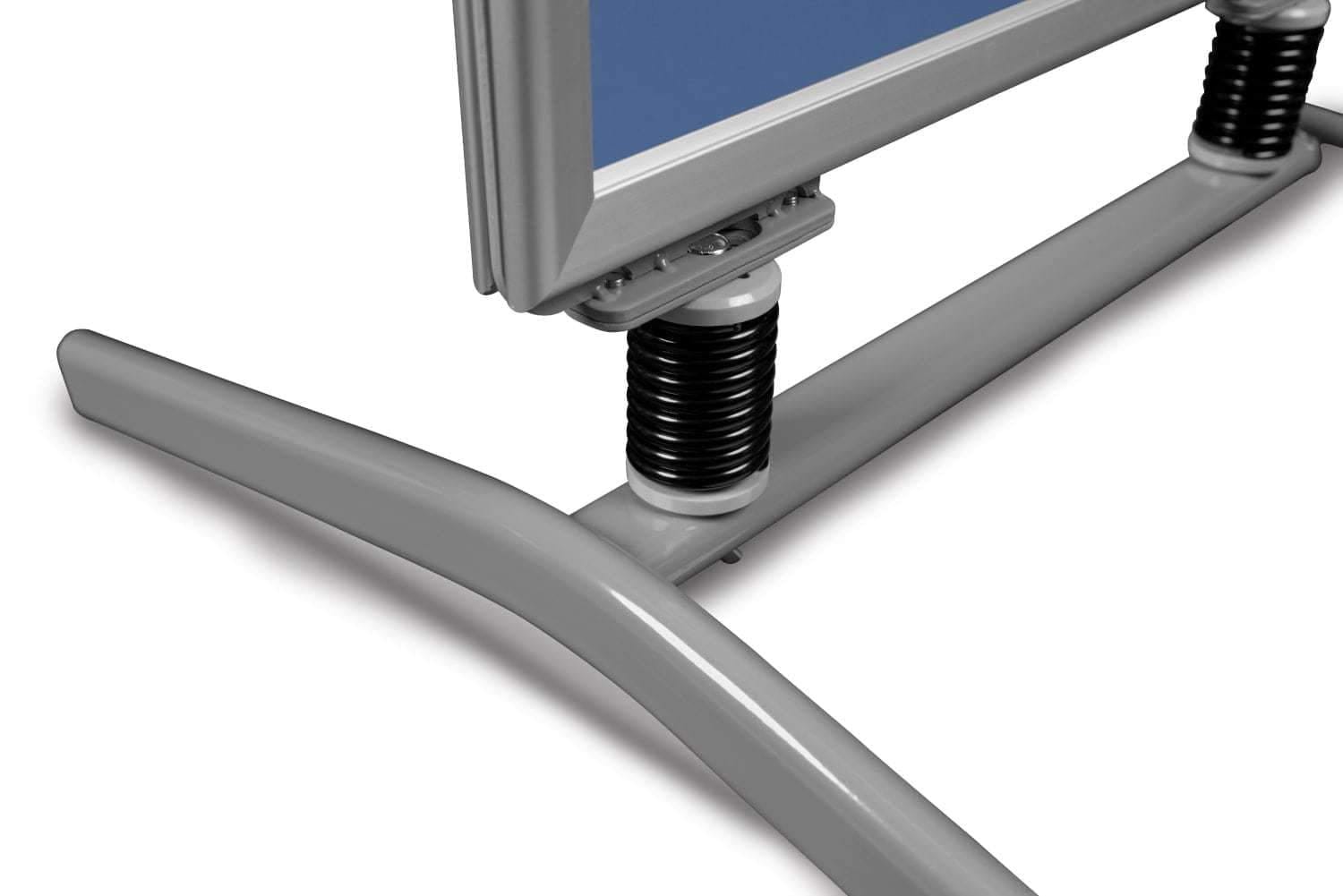 - Zastosowanie sprężyn pomiędzy podstawą, a tablicą zapewnia odporność na wiatr - tablica potykacza kołysze się dostosowując się do siły wiatru zamiast się przewracać;
