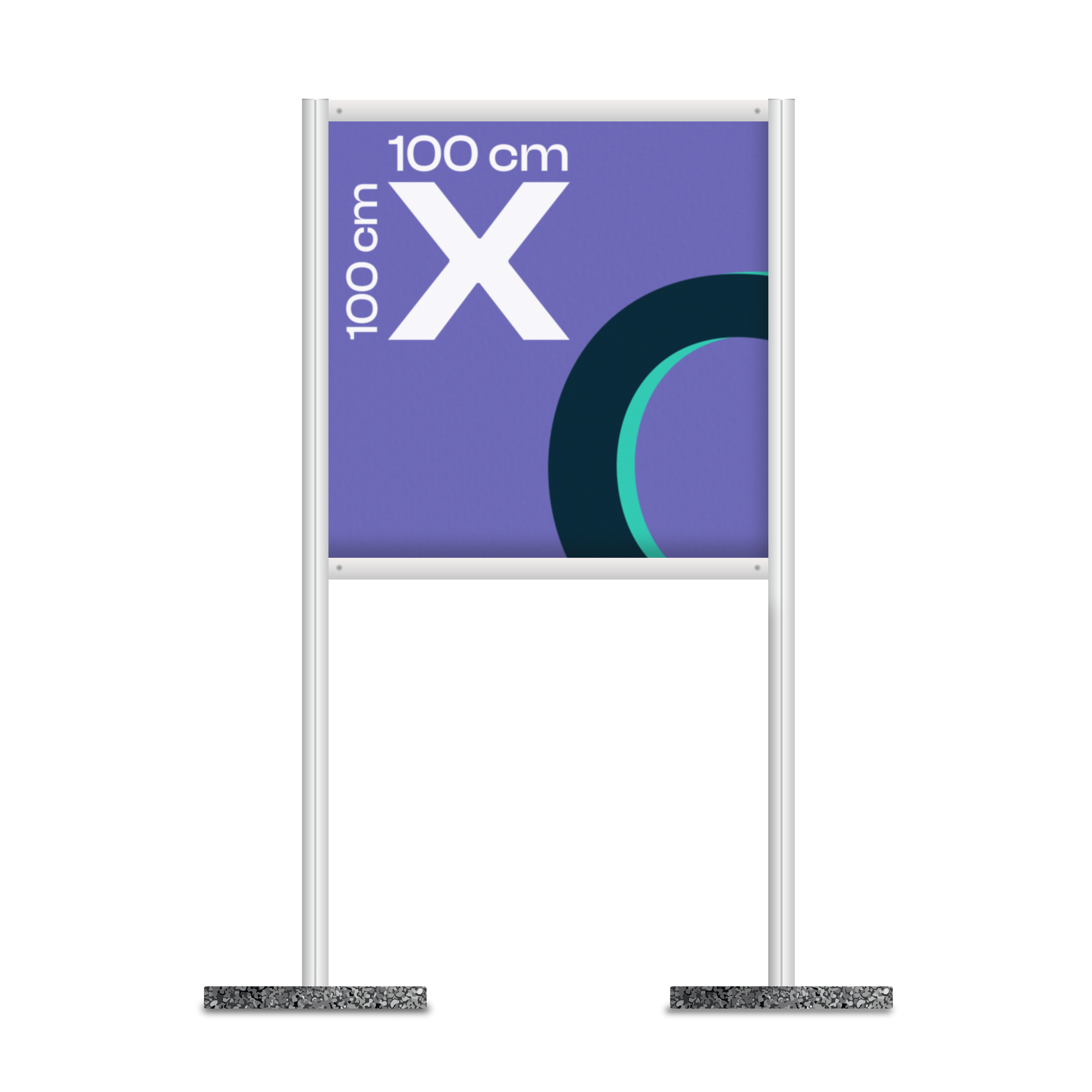Stojak Zewnętrzny 2m do wystaw plenerowych na betonowych podstawach z nadrukiem. Płyta dibond 100x100cm, z nadrukiem dwustronnym.