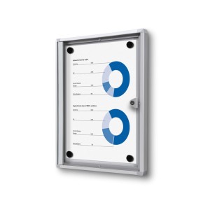 Zamykana gablota magnetyczna przeznaczona do użytku wewnętrznego, doskonała do prezentacji informacji wewnątrz budynku. Plecy gabloty zostały wykonane z blachy, dzięki czemu informację można umieścić przy pomocy magnesów, a dodatkowo po powierzchni można pisać markerami suchościeralnymi.