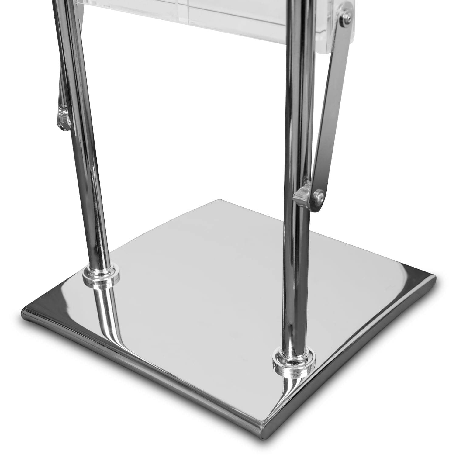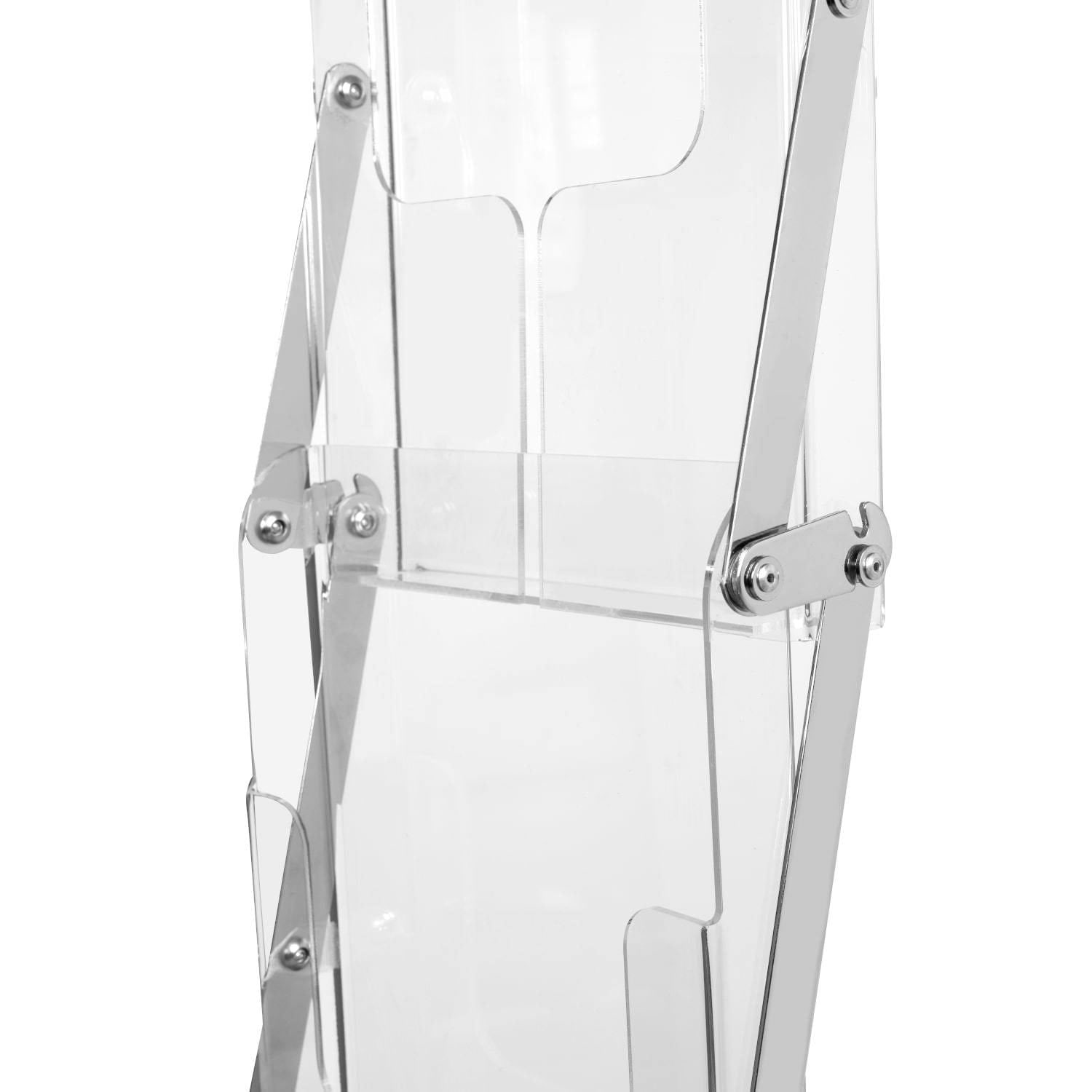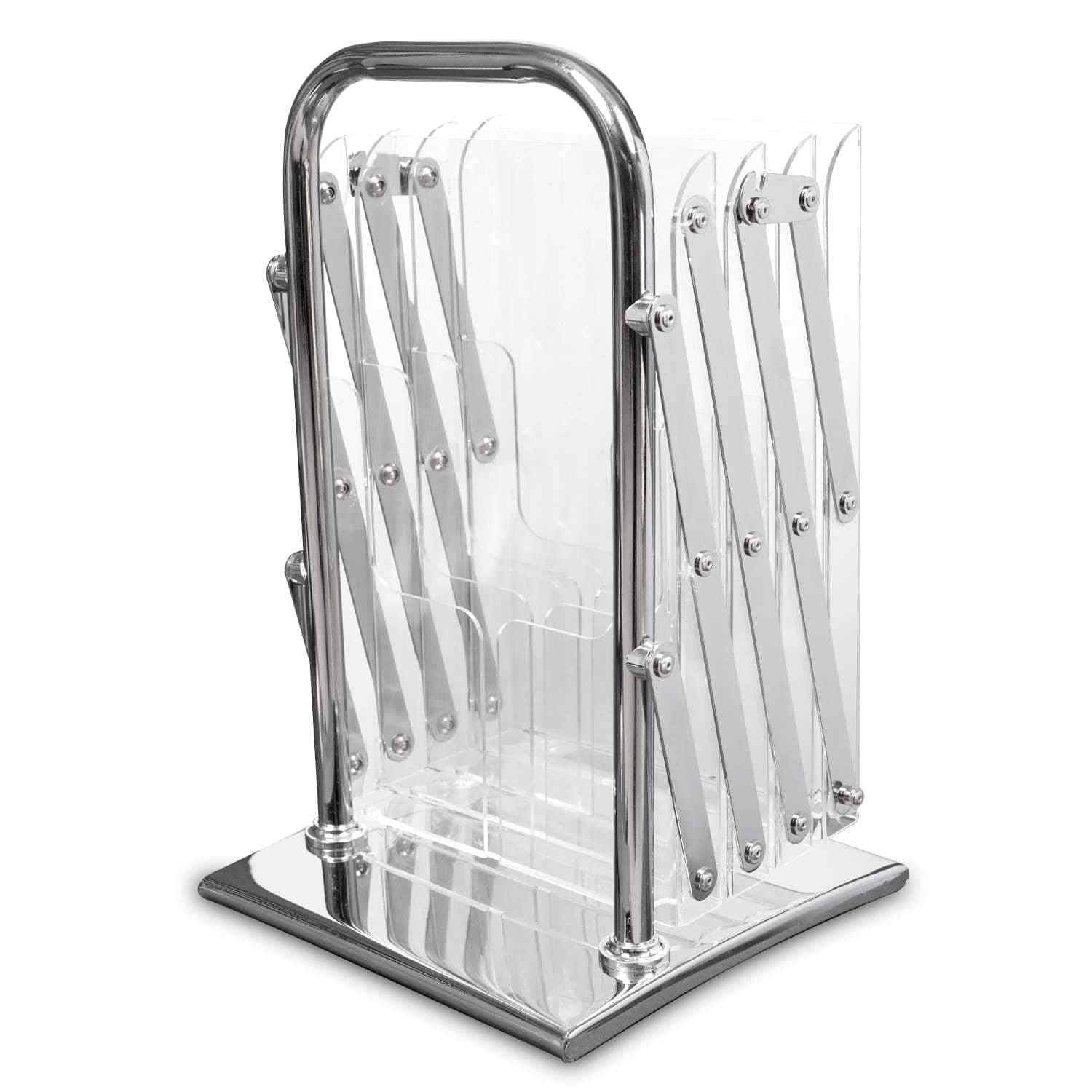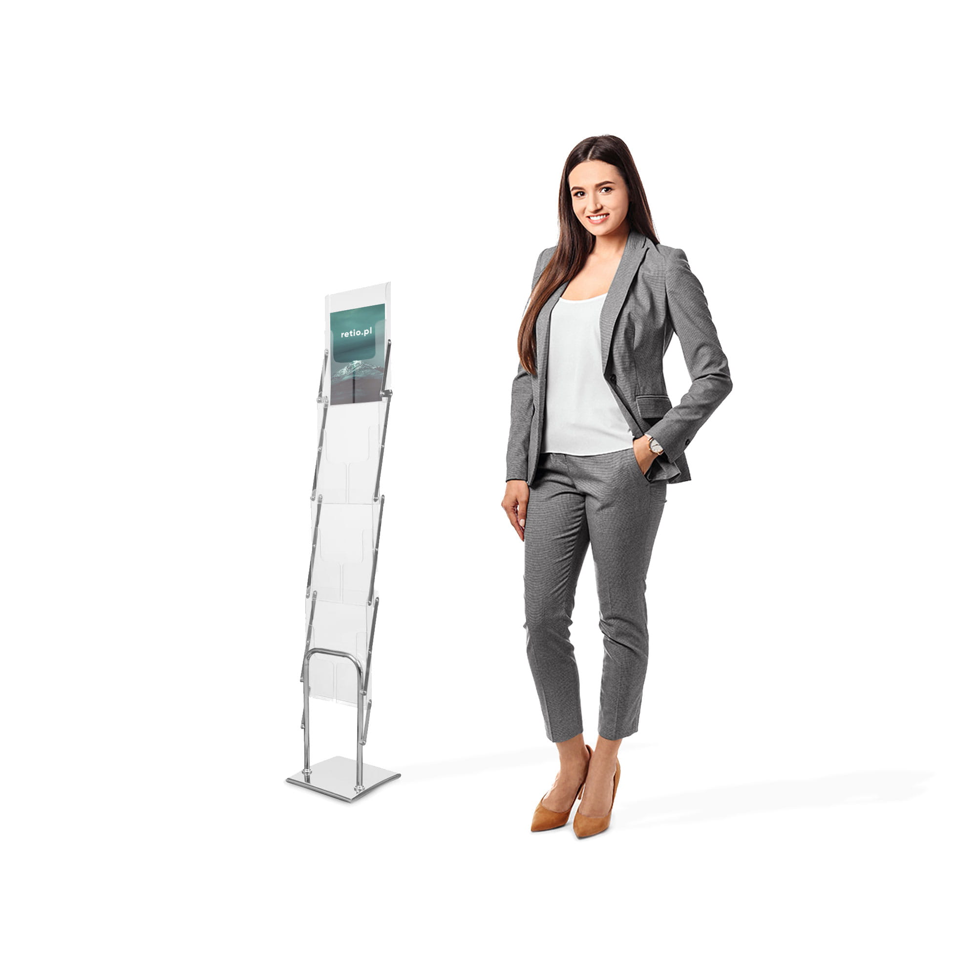 Kieszenie wykonano z grubej, przezroczystej plexi, a chromowana podstawa oraz uchwyt nadają stojakowi eleganckiego charakteru. Idealnie nadaje się do prezentacji zarówno ulotek jak i katalogów.