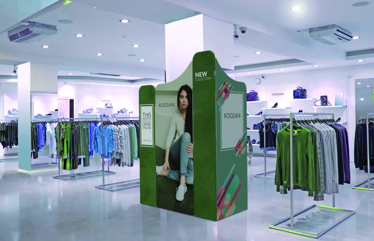 Wydruk wykonujemy techniką sublimacji na wysokiej jakości materiale Display Stretch 180 g, który cechuje znakomite nasycenie bartw. W tym wypadku są to dwie warstwy materiału połączone ze sobą zamkiem, dzięki któremu po naciągnięciu grafiki na stelaż możemy ją idealnie napiąć. Zamek jest ukryty pod maskownicą, nie zaburza więc estetyki stoiska.