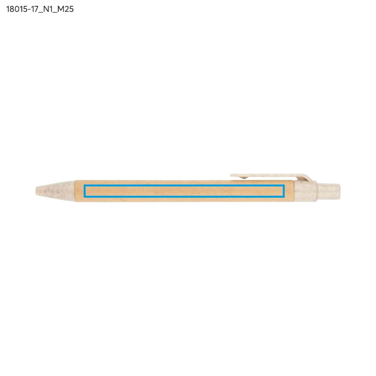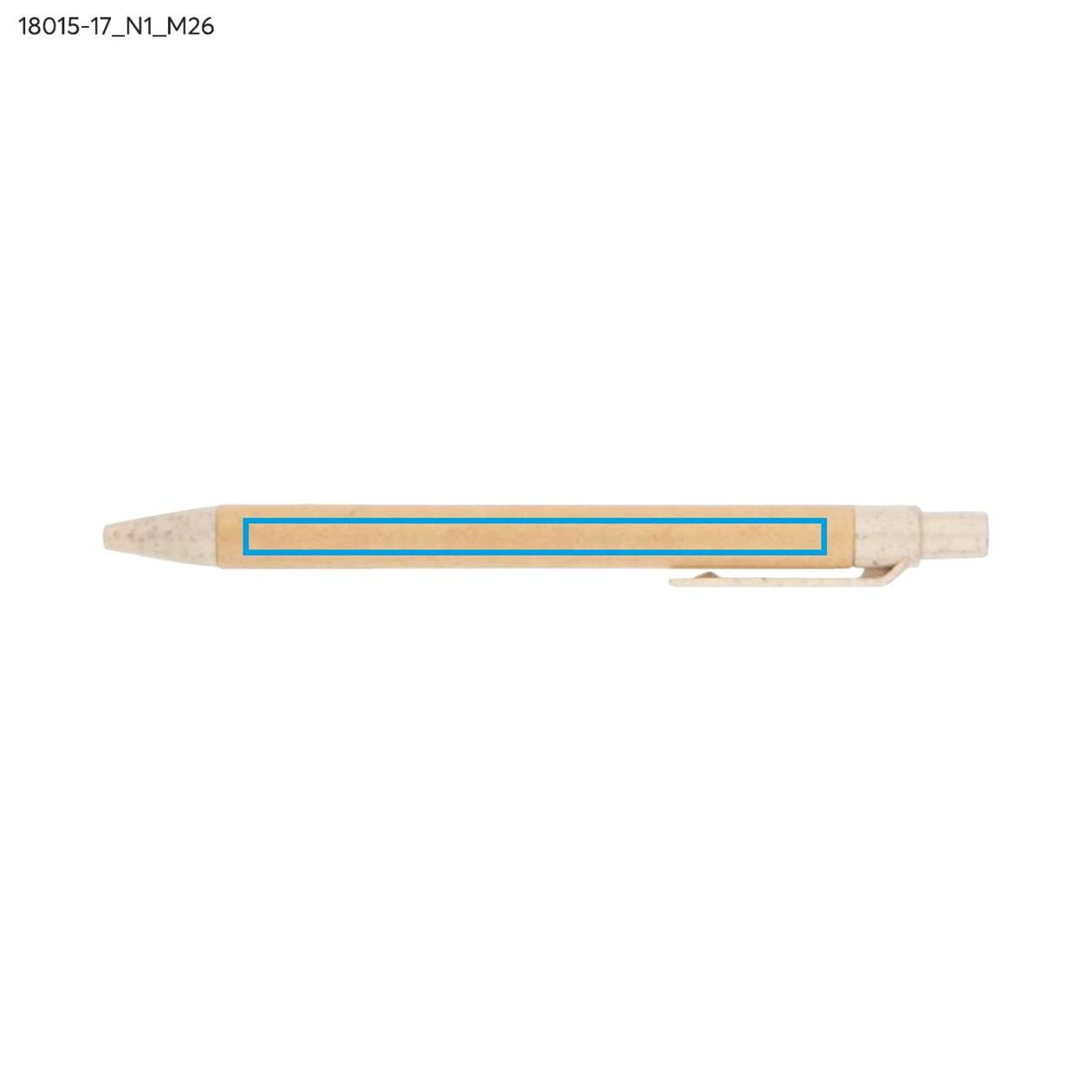 Do notesu dołączony jest długopis, który również wyróżnia się ekologicznymi walorami. Korpus długopisu wykonany z recyklingowanego papieru w połączeniu z wykończeniami z tworzywa ze słomy pszennej sprawia, że każdy element tego zestawu jest stworzony z myślą o zrównoważonym rozwoju. Niebieski wkład długopisu zapewnia komfort pisania i jest doskonałym dopełnieniem notesu. Razem stanowią harmonijną całość, która zachęca do twórczego myślenia i działania.