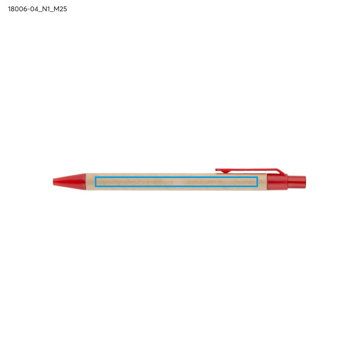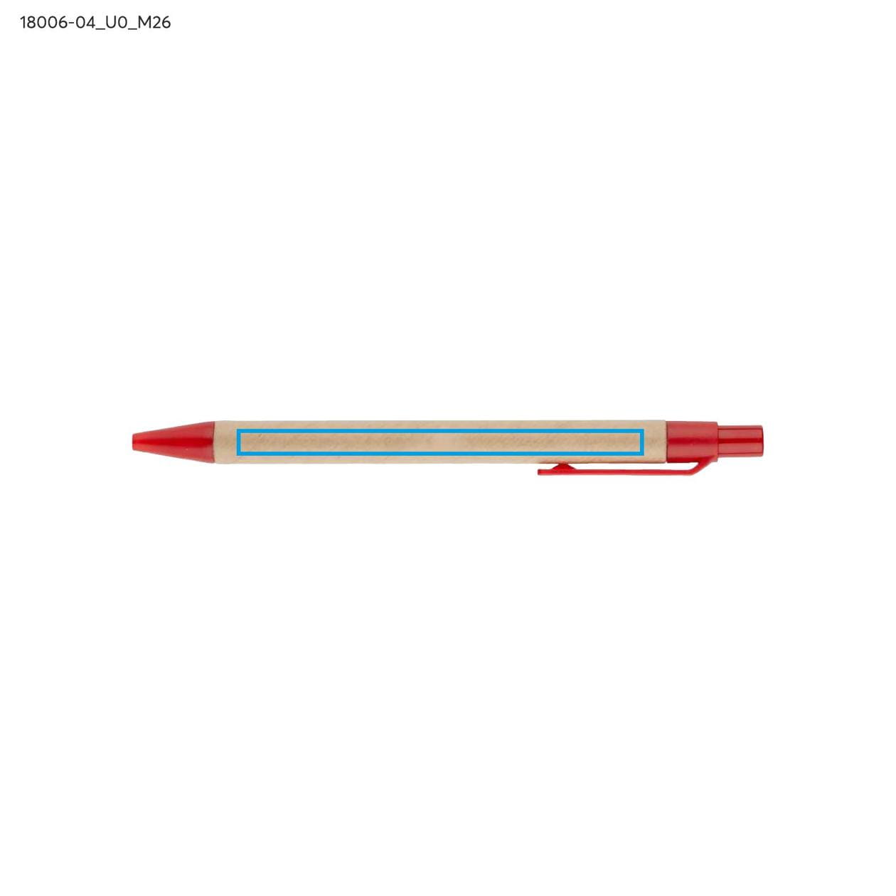 Do notesu dołączony jest praktyczny długopis, który został umieszczony w wyprofilowanym miejscu, co zapewnia wygodny dostęp do narzędzia pisarskiego w każdej chwili. Długopis charakteryzuje się korpusem wykonanym z papieru, co wpisuje się w ekologiczne trendy i dbałość o środowisko. Kolorystyczne wykończenia długopisu harmonizują z przekładką notesu, co czyni ten zestaw estetycznym i spójnym. Wkład długopisu w kolorze niebieskim zapewnia przyjemność z pisania oraz wyrazistość każdego zapisu.