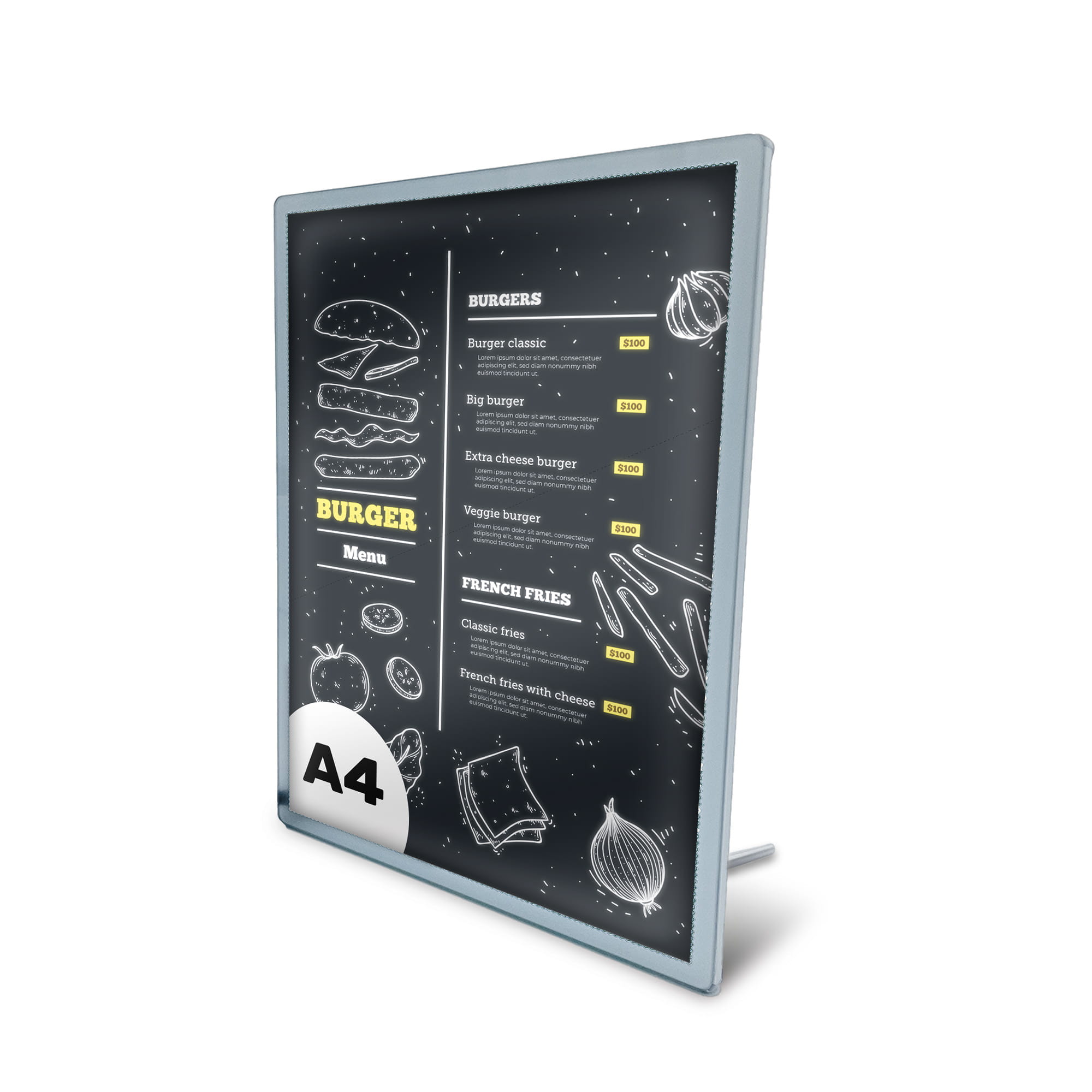 Ramka plakatowa LED podświetlana SUN A4 srebrna na biurko (21,0 x 29,7 cm) rama na plakat zdjęcia obraz podświetlana rama plakatowa