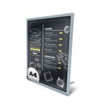 Jej solidny korpus został wykonany z lekkiego aluminium, co nadaje konstrukcji elegancji i trwałości. Front ramki, zrealizowany z szkła hartowanego, gwarantuje estetykę prezentowanych treści oraz ochronę przed uszkodzeniami. Boczki ramki, natomiast wykonane są z trwałego plastiku. To staranne wykonanie sprawia, że ramka nie tylko efektownie eksponuje zawartość, ale także stanowi trwałe i estetyczne rozwiązanie do prezentacji treści, dokumentów, zdjęć czy wszelkich innych grafik w formacie A4.