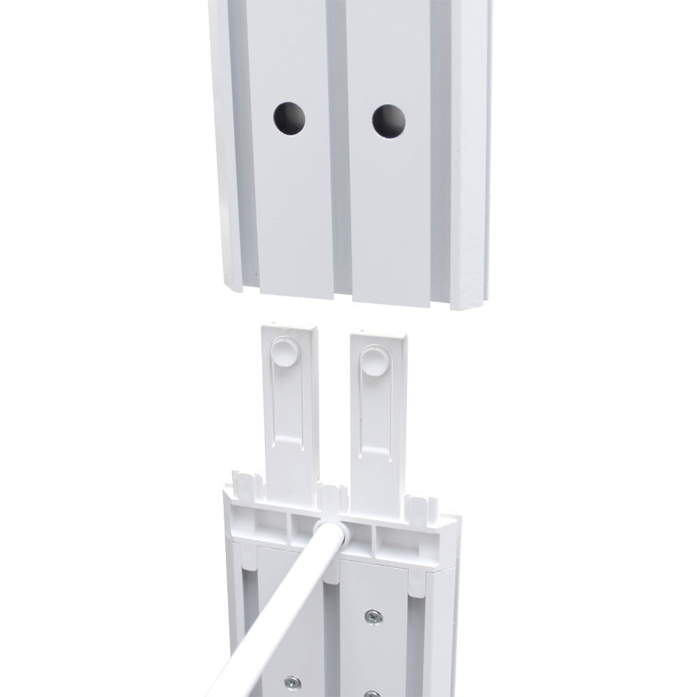Podstawą konstrukcji standu są eleganckie, białe profile aluminiowe o szerokości 100 mm, do których przymocowane jest oświetlenie LED. System montażu jest beznarzędziowy i intuicyjny, dzięki czemu rozłożenie kasetonu tak jak i jego złożenie zajmują zaledwie kilka chwil. Wyposażony jest w dwie stopy zapewniające mu stabilność na powierzchni płaskiej.