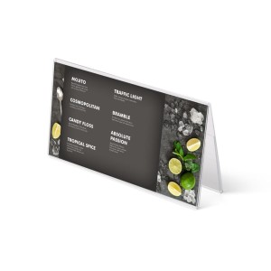 Wykonany ze szkła akrylowego stojak w kształcie litery A. Szkło akrylowe jest znane również jako pleksiglass, to wytrzymałe i elastyczne tworzywo sztuczne. Stojak można postawić na blacie lub stole, a treść umieszcza się w nim poprzez wsunięcie w kieszeń. Świetnie nadaje się do eksponowania plakatów, ulotek i innych materiałów promocyjnych, czy reklamowych.