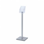 Elegancki aluminiowy słupek podtrzymujący w kolorze srebrnym posiada solidną, prostokątną podstawę, która zapewnia pełną stabilność i możliwość dostosowania położenia stojaka w pomieszczeniu.
