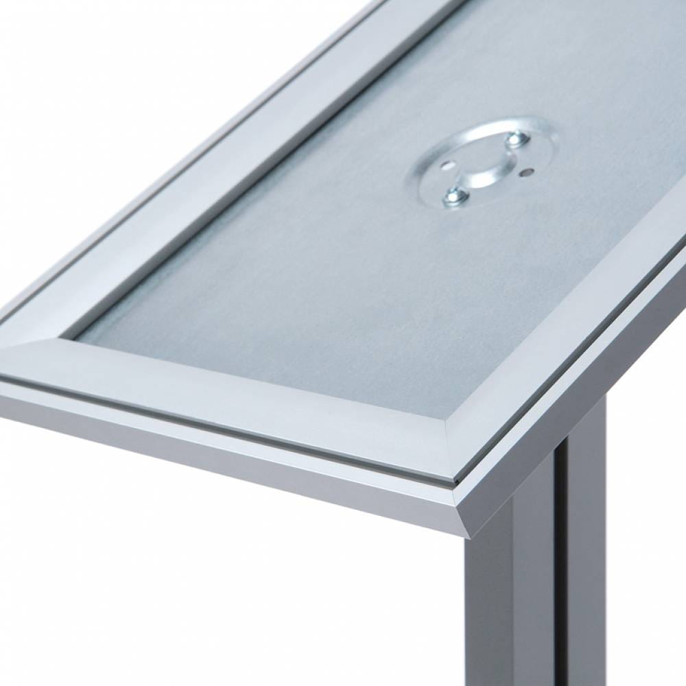 Zatrzaskowa rama menu o profilu 37 mm, wykończona ostrymi narożnikami chroni treści przed dostępem nieautoryzowanych osób trzecich. Jest to niezbędne i bezpieczne rozwiązanie w przypadku wykorzystania stojaka w miejscu publicznym. Rama opiera się na srebrnym anodowanym aluminiowym słupku.