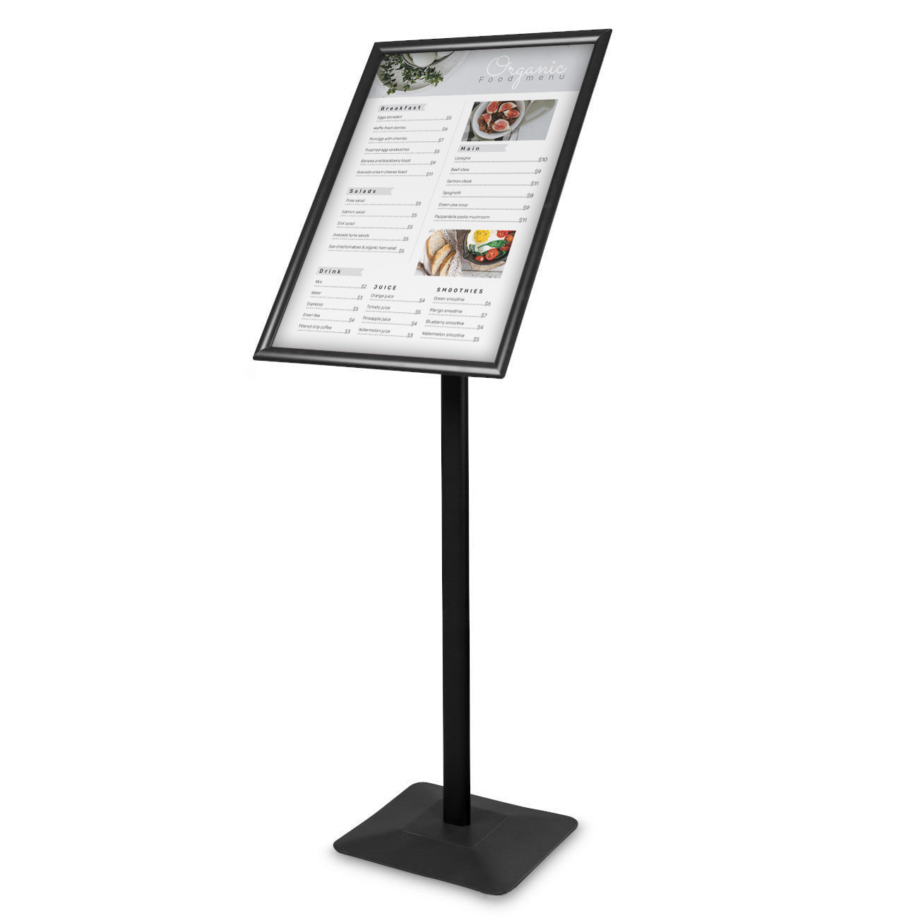 Stojak został zaprojektowany z myślą o hotelach i gastronomii. Atutem stojaka jest bardzo łatwa i szybka wymiana grafiki następuje ona na zasadzie popularnej ramki zatrzaskowej OWZ. Dzięki eleganckiemu wyglądowi, idealnie sprawdzi się w nowoczesnych pomieszczeniach. Tabliczką możemy obracać.
