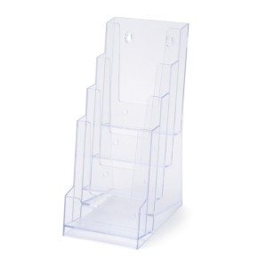 Niezwykle praktyczny i uniwersalny stojak na ulotki w którym możesz umieścić ulotki lub prospekty. Stojak na ulotki wykonany jest z wysokiej jakości przezroczystego polistyrenu. Wykonano go metodą wtryskową, czyli jest to odlew z formy, dzięki czemu uzyskano najwyższą jakość wykończenia i 100% powtarzalność każdej sztuki stojaka.