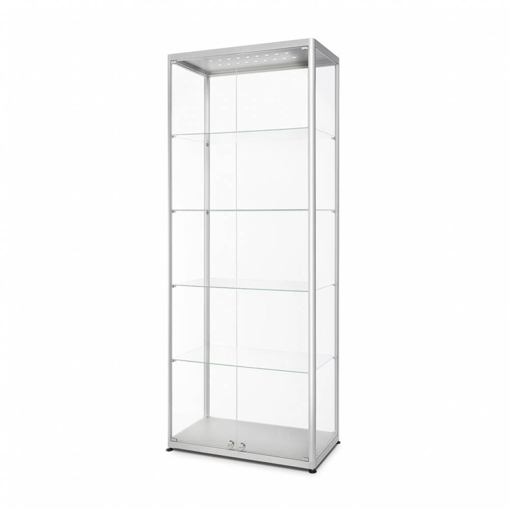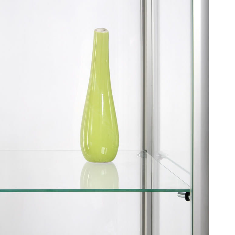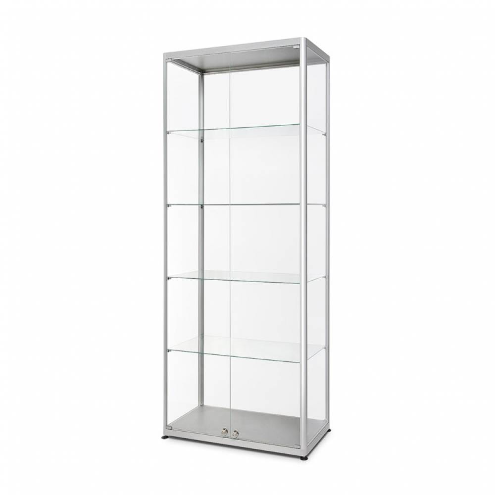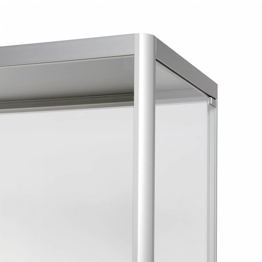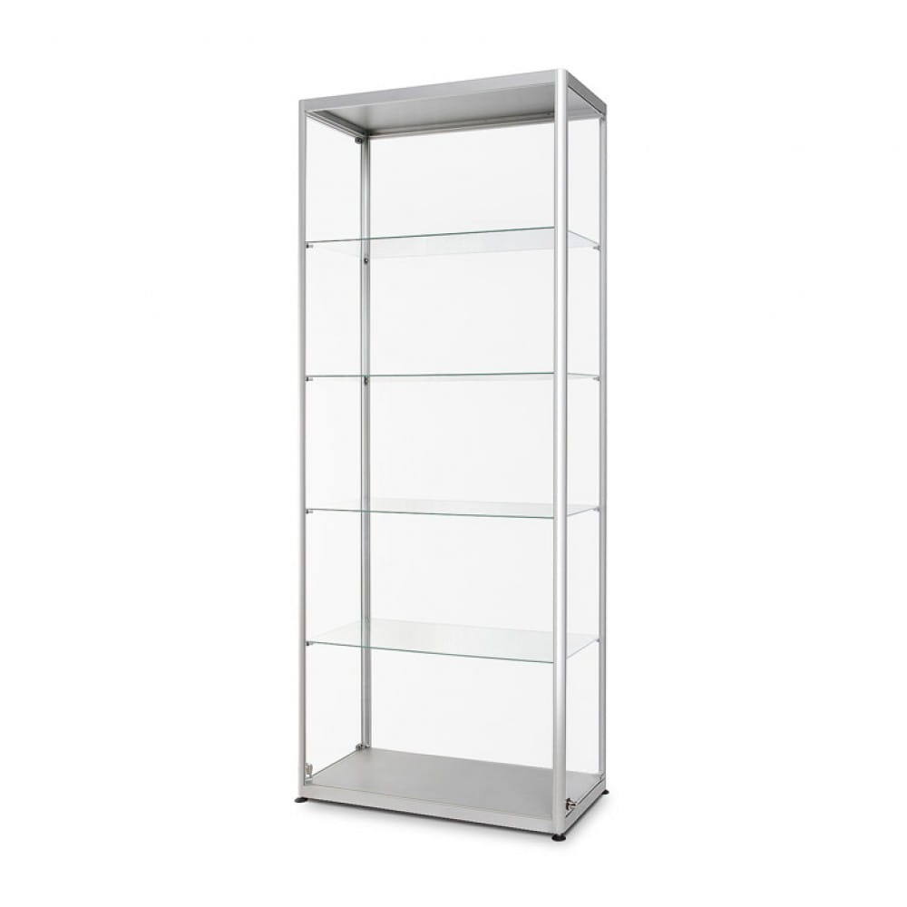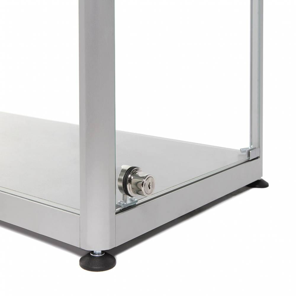 Konstrukcja opiera się na minimalistycznym, nowoczesnym stelażu wykonanym z aluminium w kolorze srebrnym. Umieszczono pod nim 4 nóżki pozwalające Ci z łatwością dostosować gablotę do swoich potrzeb, zapewniając jej pełną stabilność. Szklane panele gwarantują pełną przejrzystość i widoczność przechowywanych przedmiotów, podkreślając ich wartość i piękno.