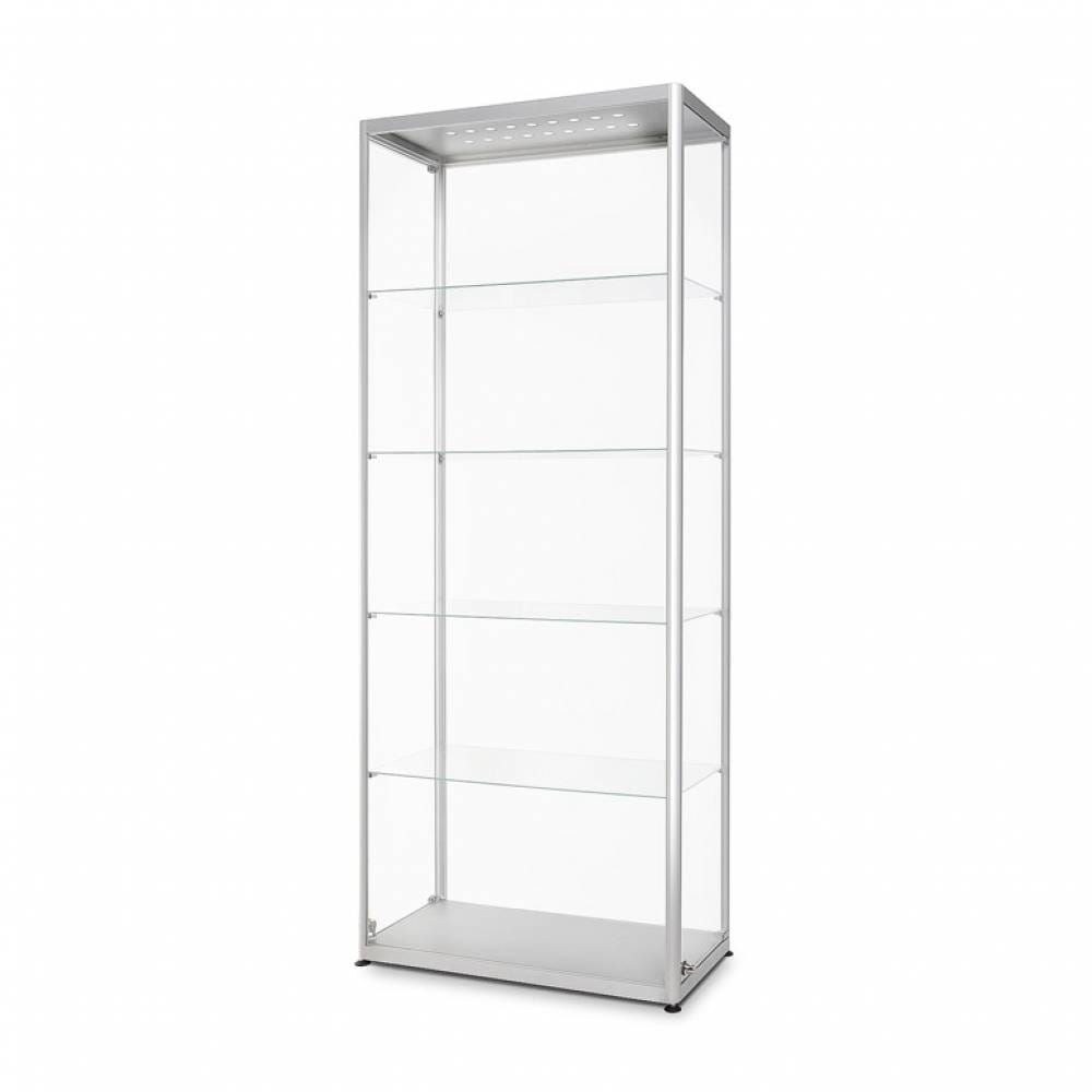 Szklana witryna stojąca 80x200x40 cm zamykana na kluczyk z prostokątną podstawą przeznaczona do użytku wewnętrznego