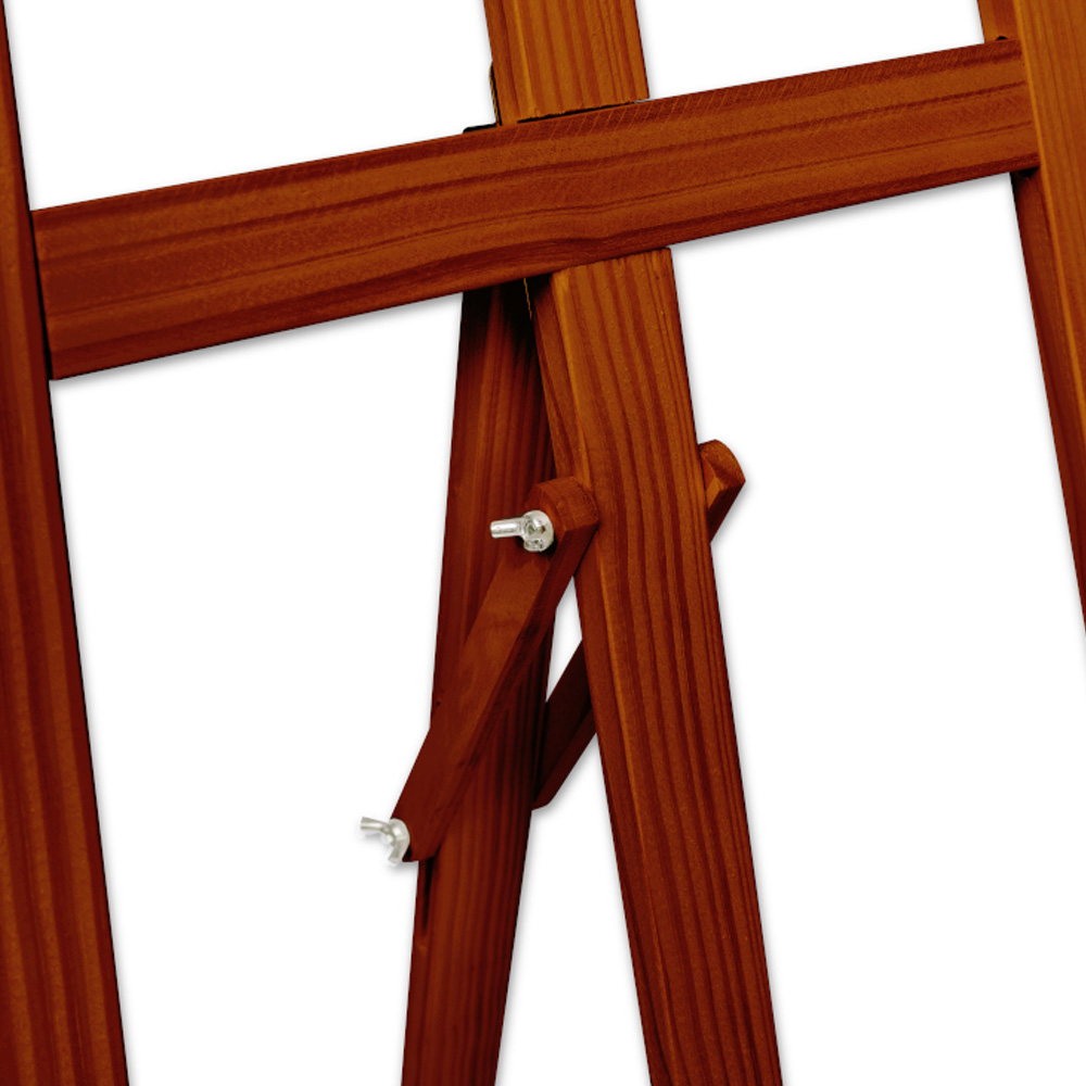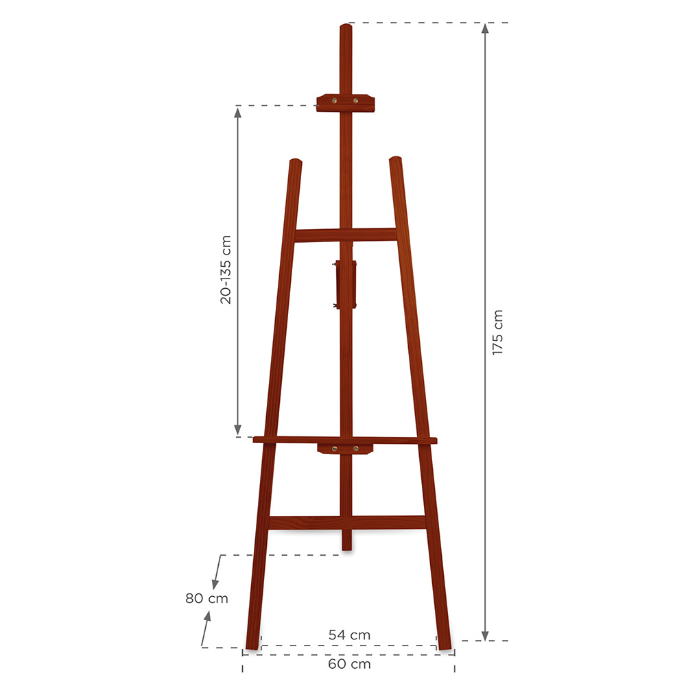 Stabilna, drewniana sztaluga 175 x 60 cm w kolorze brązowa o szerokim zastosowaniu i regulowanym kącie nachylenia. Produkt sprawdzi się świetnie zarówno jako stojak malarski, jak i nośnik reklamy oraz stojak przeznaczony do ekspozycji ramy lub antyramy ze zdjęciem. Popularny w restauracjach, kwiaciarniach oraz na różnego rodzaju eventach.