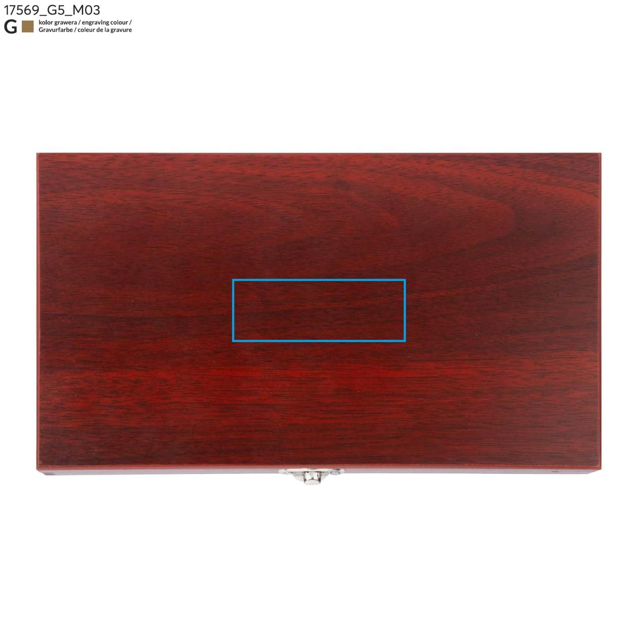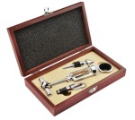 Zestaw do wina składający się z korkociągu, 2 zatyczek (jedna z funkcją nalewaka), obrączki na szyjkę butelki zabezpieczającej przed kapaniem. Całość zapakowana w eleganckie drewniane pudełko. Logo wygrawerujemy na pudełku.