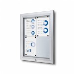 Bezpieczeństwo: Gablota zależnie od ilości arkuszy posiada pojedynczy bądź podwójny zamek na kluczyk, który chroni treści przed nieautoryzowanym dostępem osób trzecich. Panel przedni wykonano z bezpiecznego szkła ESG o grubości 4 mm zapewniając dobrą widoczność, jednocześnie zwiększając bezpieczeństwo.